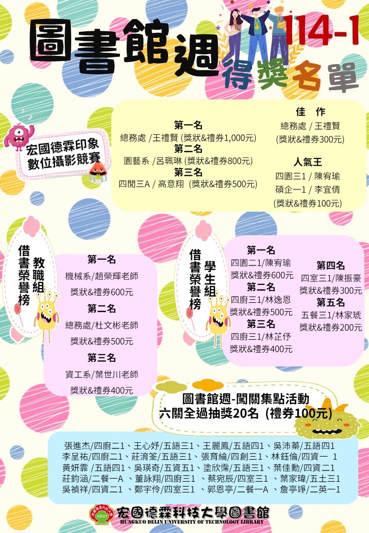 各位同學~看過來~ 「114年圖書館週系列活動得獎名單」、「宏國德霖印象攝影展得獎作品名單」 通通出爐囉~ ※114年宏國德霖印象數位攝影競賽得獎 詳細名單及照片( 請點選 ) 看看自己有沒有中獎吧~!!
