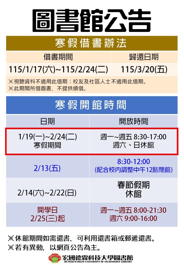 圖書館115年寒假借書&開館時間