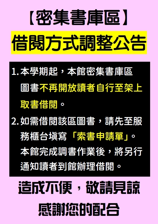 密集書庫區借閱方式調整