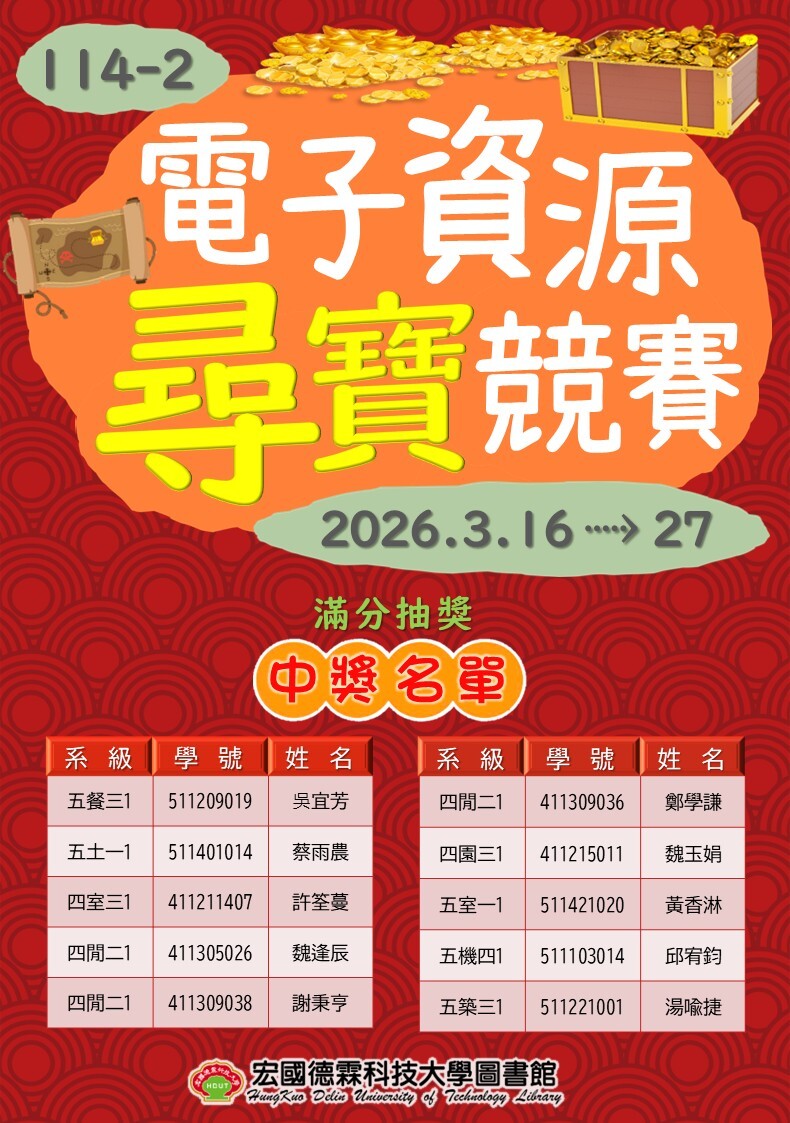 114-2「電子資源尋寶競賽」中獎名單出爐囉~~