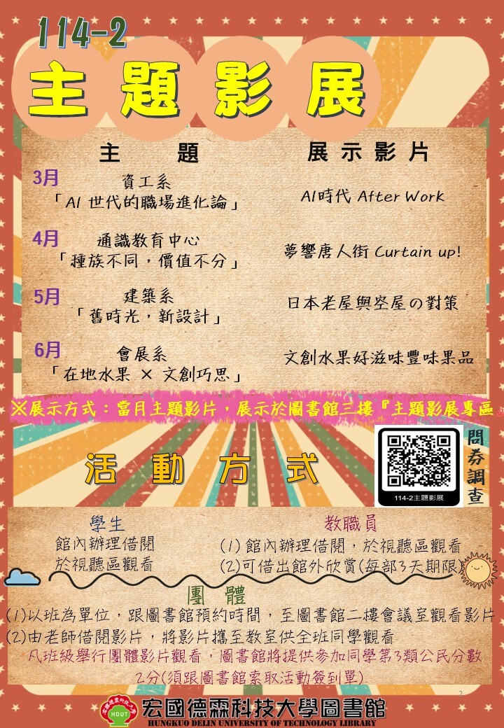 *凡班級舉行團體影片觀看,圖書館將提供參加同學 第 3 類公民分數2分(須跟圖書館索取活動簽到單)