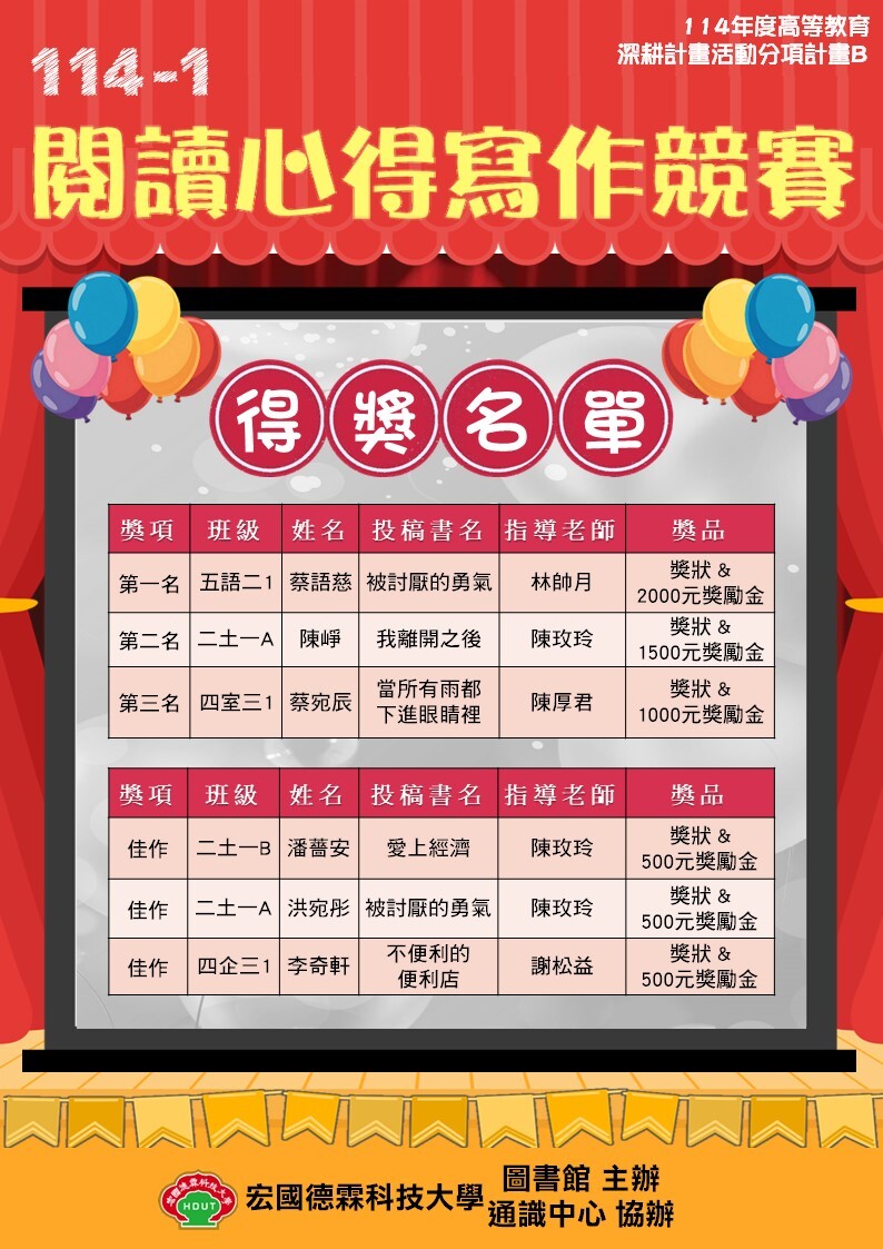 114-1閱讀心得寫作競賽得獎名單 出爐囉~